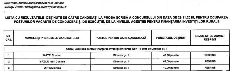 La proba scrisă, Mazilu a obținut 62 de puncte, Matei abia 46, iar Oprea doar 10, iar cum minimul necesar pentru a trece la etapa următoare, cea de interviu, era de 70 de puncte, toți au fost declarați respinși. Trebuie spus că Cristian Matei este pentru a doua oară când participă la concurs, însă a eșuat lamentabil și la precedenta încercare. Deja Agenția pentru Finanțarea Investițiilor Rurale organizează, din două în două luni, concurs pentru ocuparea funcției de director al structurii de la Gorj. După ce, în septembrie, singurul candidat, Cristian Matei a fost respins, în urma rezultatului de la proba scrisă unde a obținut 58 de puncte, nici la finele lui noiembrie, niciunul dintre candidați nu a reușit să ocupe postul, așa că, cel mai probabil concursul va fi reluat în primele luni ale anului viitor. Până atunci, interimatul lui Cosmin Mazilu la șefia OJFIR Gorj se va prelungi.