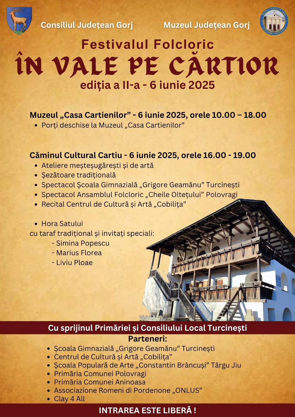 Evenimentul este organizat de Muzeul Județean Gorj „Alexandru Ștefulescu” și Consiliul Județean Gorj și promite o zi întreagă dedicată autenticității românești. Festivalul își va desfășura activitățile în două locații reprezentative din Turcinești. Între orele 10:00 și 18:00, vizitatorii sunt invitați la Muzeul „Casa Cartienilor”, unde porțile vor fi deschise pentru toți cei dornici să pătrundă într-un colț de istorie vie, redescoperind patrimoniul și specificul zonei.