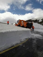 Mobilizare de forțe pentru deszăpezirea Transalpinei! Angajații Secției Drumuri Naționale Vâlcea au ajuns, ieri, cu autofreza la Vârful Cărbunele (2175 m). Pe de altă parte, drumarii gorjeni acționează dinspre Rânca spre Obârşia Lotrului.