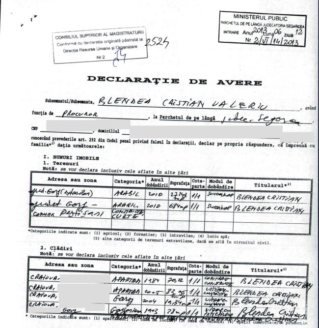 Procurorul Cristian Valeriu Blendea este din Gorj, mai precis din Hobiţa, acesta deţinând urmare a succesiunii, de pe urma tatălui său, două terenuri în Peştişani. Este vorba despre un teren arabil de 27.242 de mp şi încă unul de 684 de mp. Amblele le-a primit la decesul tatălui său, şi el fost procuror la Parchetul de pe lângă Curtea de Apel Craiova, decedat însă în 2010, când fiul primeşte, conform succesiunii, proprietăţile în cauză. Averea lui Blendea, conform propriei declaraţii de avere din 2013, mai cuprinde încă două apartamente în Craiova, un garaj tot aici, şi o garsonieră, dar şi două maşini. Soţia, Daniela Blendea, este medic la Spitalul Clinic de Urgenţă Craiova şi oferă consultaţii şi la un cabinet privat.
