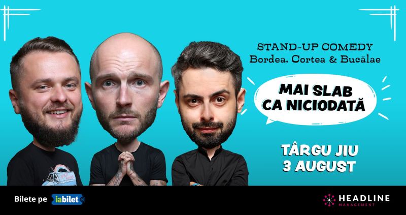 Bordea, Cortea și Bucălae, trei actori cunoscuți la ora actuală pe scena românească a stand-up-ului, vor veni la Târgu-Jiu la finele acestei săptămâni, mai precis sâmbătă, 3 august. Cei trei vor oferi un adevărat show cu multe râsete și voie bune. Spectacolul va începe la ora 21.00 și va dura o oră și jumătate, urmând a se desfășura în sala de spectacole a Teatrului Dramatic ,,Elvira Godeanu” Târgu-Jiu. Show-ul este intitulat ,,Mai slab ca niciodată”, iar biletele au fost deja puse în vânzare atât la sediul Teatrului ,,Elvira Godeanu”, cât și pe platforma iabilet.ro. Prețul unui bilet unic este de 55 de lei, mai fiind disponibile spre achiziționare circa 30 de tichete de intrare la spectacolul oferit de cei trei stand-ul-eri deosebit de apreciați la nivel național. Biletele pot fi prezentate atât în format fizic (print), cât și în format digital (pe telefon). Pentru acest eveniment nu este permisă renunțarea la biletele achiziționate. În caz de anulare a evenimentului, veți fi notificat pe email, iar contravaloarea biletelor este returnată în maximum 7 zile lucrătoare.