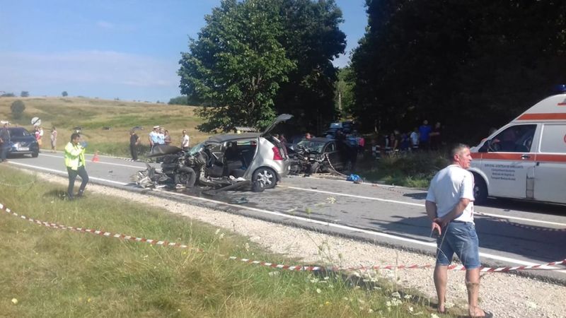 Două autoturisme s-au lovit frontal după ce şoferul din Gorj s-ar fi angajat într-o depăşire neregulamentară. În urma impactului, două persoane au murit pe loc, o a treia fiind găsită în stop cardio-respirator, medicii de pe ambulanţă declarând-o decedată după ce s-a încercat minute în şir resuscitarea ei. „Primele două persoane decedate sunt şoferul şi pasagerul din faţă, aflate într-un autoturism înmatriculat în judeţul Gorj.