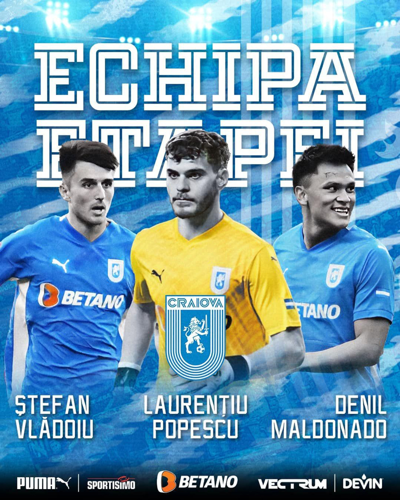 Laurențiu Popescu, Ştefan Vlădoiu și Denil Maldonado, de la Universitatea Craiova, au fost printre cei mai buni jucători ai rundei a cincea din play-off/play-out în viziunea Ligii Profesioniste de Fotbal. Portarul, fundașul dreapta și fundașul central sunt în 11-le ideal după victoria oltenilor de la Sepsi, scor 1-3. A fost primul succes al lui Costel Gâlcă pe banca tehnică a doljenilor, fostul internațional debutând cu dreptul ca principal.
