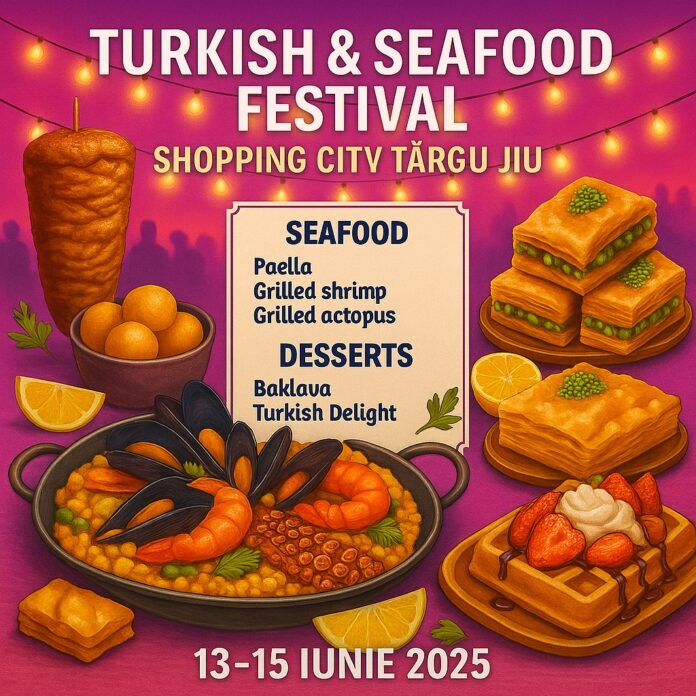 Parcarea mall-ului din Târgu Jiu devine, pentru trei zile, capitala gusturilor autentice! În perioada 13–15 iunie 2025, între orele 12:00 și 23:00, gorjenii sunt invitați să ia parte la „Turkish & Seafood Festival”, un eveniment culinar care aduce la un loc savoarea orientală și rafinamentul fructelor de mare. Intrarea este liberă!