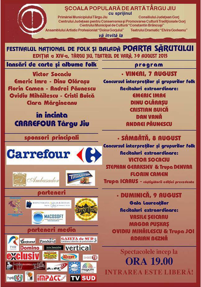 Fiecare dintre cele trei zile ale festivalului va oferi gorjenilor ocazia de a asculta, pe lângă tinerii talentaţi înscrişi în concurs, nume mari ale folkului românesc. De exemplu, vineri, în prima seară a festivalului, pe scenă va urca Emeric Imre. „De vineri o să înceapă la Târgu-Jiu cea de-a XIV-a ediţie a Festivalului Naţional de Muzică Folk şi Baladă „Poarta Sărutului”. Va fi un regal al muzicii folk şi al poeziei la Târgu-Jiu. Vineri, 7 august, începând cu orele 19.00, la Teatrul de Vară din Târgu-Jiu, va avea loc concursul interpreţilor şi grupurilor folk, urmat de recitaluri extraordinare ale lui Andrei Păunescu, Cristi Buică, Dan Vană şi Dinu Olăraşu. În încheierea serii îl vom putea urmări pe scena Teatrului de Vară din Târgu-Jiu pe prietenul nostru drag, îndrăgitul artist Emeric Imre”, a declarat Iani Gârbaciu, purtătorul de cuvânt al Şcolii Populare de Artă Târgu-Jiu. Şi în serile de sâmbătă şi duminică iubitorii de folk vor avea ce vedea. „Sâmbătă, 8 august, tot cu începere de la ora 19.00, tot pe scena