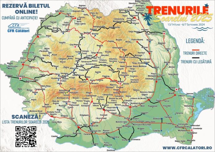 CFR Călători lansează și în acest an tradiționalul program estival de transport „Trenurile Soarelui”, care va fi activ în perioada 13/14 iunie – 6/7 septembrie 2025. În acest interval, 54 de trenuri directe vor lega zilnic principalele orașe din țară de litoralul Mării Negre, asigurând acces facil către destinațiile preferate de vacanță.