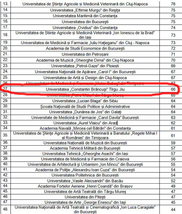 Topul Universităţilor Curate, lansat, ieri, de Societatea Academică din România, a fost realizat în funcţie de informaţiile publicate de instituţiile de învăţământ superior atât legat de achiziţiile publice pe care le fac, cât şi de declaraţiile de avere şi interese ale rectorilor şi cadrelor didactice. Universitatea “Constantin Brâncuşi” din Târgu-Jiu ocupă locul 27 în acest top al transparenţei, având un punctaj de 66 de puncte. UCB-ul a reuşit de devanseze, la acest capitol, Universitatea “Lucian Blaga” din Sibiu, Şcoala Naţională de Studii Politice şi Administrative, universităţile de medicină şi farmacie din capitală şi Craiova şi chiar Universitatea Politehnică din Bucureşti.