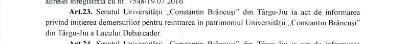 În ședința de Senat a UCB din 28 iulie, reprezentanții acestui for de conducere a Universității “Constantin Brâncuși” din Târgu-Jiu au fost informați în legătură cu “inițierea demersurilor pentru reintrarea în patrimoniul UCB a Lacului Debarcader”. Asta deoarece conducerea universității a stabilit să caute, acum, anexele Hotărârii de Guvern date cu 24 de ani în urmă, când UCB Târgu-Jiu prelua atunci fostul hotel aparținând Biroului de Turism și Tineret Gorj, din zona Debarcader. Înainte de a se lua decizia reîntregirii patrimoniului, s-a căutat în arhive, iar documentele depistate nu arată că lacul s-ar fi transferat la vreo altă instituție, gen Primăria Târgu-Jiu, ori la vreun privat.