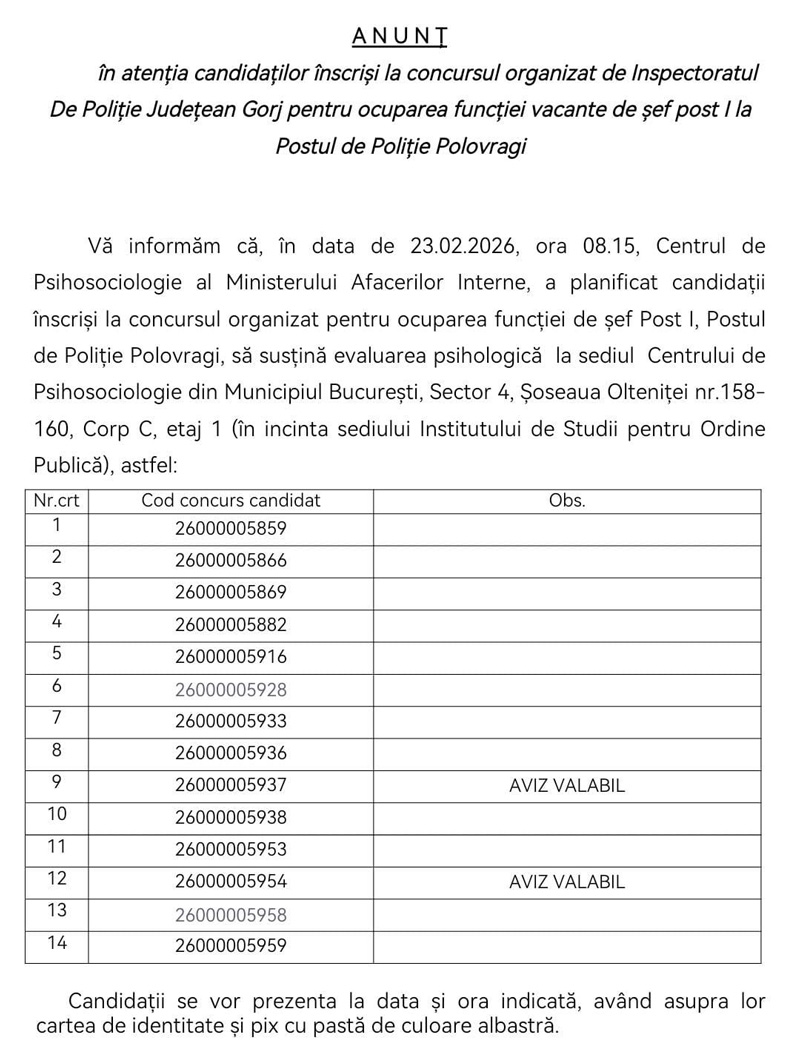 ,,În data de 23.02.2026, ora 08.15, Centrul de Psihosociologie al Ministerului Afacerilor Interne a planificat candidații înscriși la concursul organizat pentru ocuparea funcției de șef Post I, Postul de Poliție Polovragi, să susțină evaluarea psihologică. Candidații se vor prezenta la data și ora indicată, având asupra lor cartea de identitate și pix cu pastă de culoare albastră”, potrivit anunțului postat pe portalul de servicii de la nivelul Ministerului Afacerilor Interne.