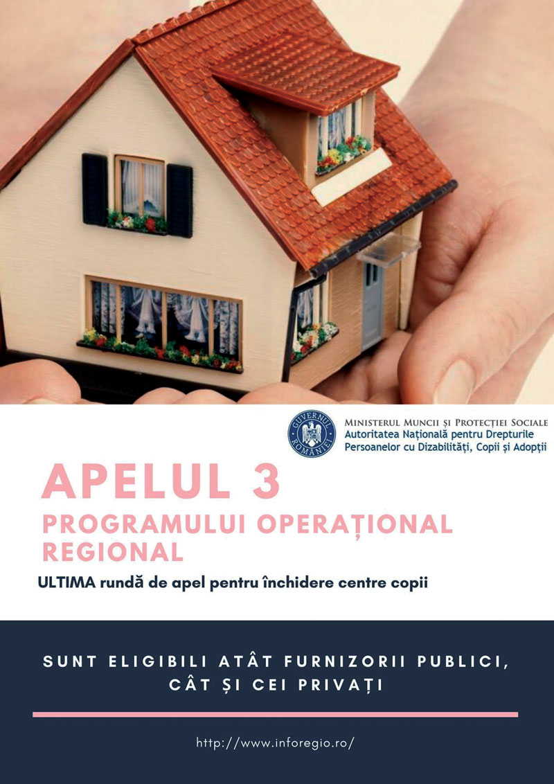 Conducerea Autorității Naționale pentru Drepturile Persoanelor cu Dizabilități, Copii și Adopții (ANDPDCA) a anunțat faptul că a fost prelungită cu încă 2 luni perioada de depunere a cererilor de finanțare pentru apelul de proiecte din cadrul Programului Operațional Regional, vă informăm că și cel de-al treilea apel în cadrul Axei nr. 8 Obiectivul specific 8 .3 – Creșterea gradului de acoperire cu servicii sociale, grupul vulnerabil copii, astfel că data de închidere a apelului este 1 aprilie 2021.