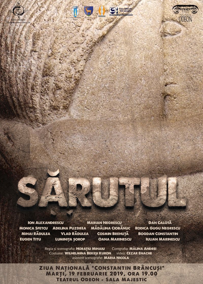 Despre acest spectacol, Cosmin Brehuţă, directorul Teatrului Dramatic “Elvira Godeanu” din Târgu-Jiu, spune că este o onoare, la eveniment urmând a participa invitaţi de seamă. “Referitor la Ziua Naţională Brâncuşi, suntem bucuroşi şi onoraţi să-l sărbătorim pe patronul spiritual al oraşului nostru, în Bucureşti, în deplasare. Suntem bucuroşi că vom fi foarte aproape de kilometrul zero, la Teatrul Odeon, la acest eveniment organizat în parteneriat cu Asociaţia Culturală Fiii Gorjului, cu Asociaţia Acasă la Brâncuşi, cu Instituţia Prefectului şi Consiliul Judeţean. Spectacolul “Sărutul”, în regia lui Horaţiu Mihaiu, eseu vizual-teatral, şi în coregrafia Mălinei Andrei, va fi prezentat pe 19 februarie, la ora 19.00, la Teatrul Odeon din Bucureşti. Este o adevărată bucurie pentru noi pentru că e cel mai bun loc, cea mai bună locaţie în care să putem desfăşura la standardele cele mai apropiate de cele pe care le avem şi noi aici, la sala din Teatrul Dramatic “Elvira Godeanu”, şi suntem mândri că o putem face mai ales că vom avea parte de invitaţi de marcă, atât din partea oficialităţilor de la nivel local, judeţean, cât şi naţional, şi evident că vor fi prezenţi şi foarte mulţi oameni de specialitate, oameni de teatru, directori, critici, cu care împreună sper să avem o seară reuşită. Este adevărat că acest eveniment face parte dintr-un ansamblu de manifestări. Trebuie să amintesc şi de expoziţia de arte vizuale a lucrărilor artiştilor din Gorj, desfăşurată la Centrul Cultural al Ministerului Afacerilor Interne. Este un eveniment realizat cu sprijinul Ministerului Culturii şi al Identităţii Naţionale. Practic, mă bucur că majoritatea instituţiilor municipiului Târgu-Jiu şi ale judeţului Gorj îşi dau mâna în această zi cu adevărat importantă pentru noi şi că putem vorbi despre Brâncuşi şi în deplasare”, a declarat directorul Teatrului Dramatic “Elvira Godeanu”. Piesa “Sărutul”, în viziunea regizorului Horațiu Mihaiu, urmărește să decodifice izvoarele inspirației lui Brâncuși, fără a încerca să ofere un răspuns cert. În acest sens, parcurgând momente esențiale din biografia sa, găsim destule elemente care ar fi putut constitui surse de inspirație pentru opera sa de geniu. “Sărutul” brâncușian, venit ca o reacție la “Sărutul” lui Rodin, întrupează și momentul ruperii artistului de academismul francez și al nașterii sculpturii moderne, pe care Brâncuși o va impune în lume. Se adresează ochiului spectatorilor, lucrează senzorial prin imagini teatrale, expresivitate corporală, sunet și culoare, încercând să redea publicului emoția gestuală a sărutului. Mai precis, este un eseu vizual teatral care evită festivismele, omagiul teatral gratuit, adresându-se în special simțurilor.