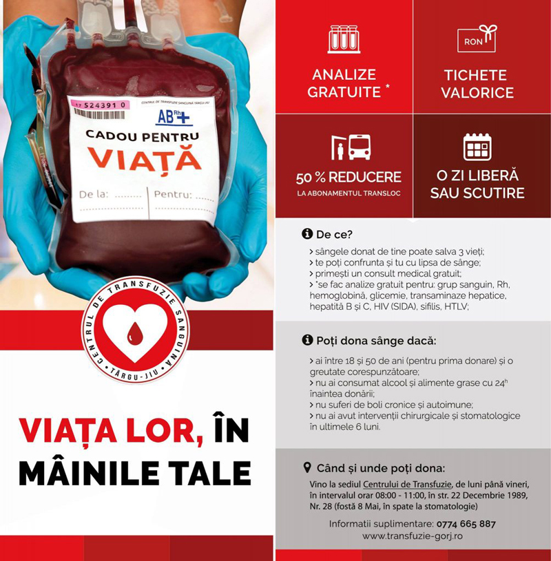 Mall-ul din Târgu-Jiu, în parteneriat cu Centrul de Transfuzie Sanguină, continuă până la finele acestei luni campania prin care se dorește convingerea cetățenilor din Gorj să aleagă să fie donatori de sânge.