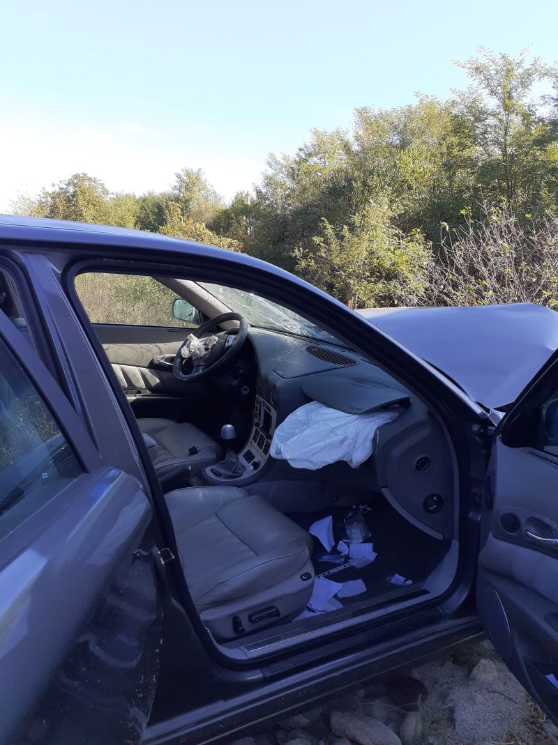 În urma accidentului, șoferul s-a ales cu capul spart, două coaste fracturate, cu cioburi pe față de la parbrizul distrus de airbaguri și cu genunchii loviți serios.