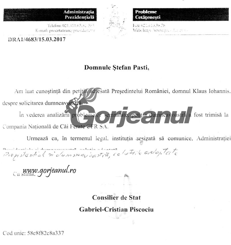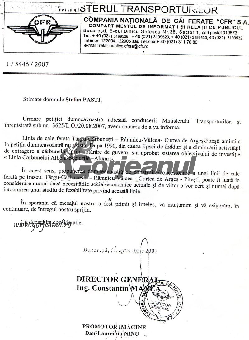 Răspunsul acesta survine după ce în 2007, gorjeanul a fost informat de Compania Națională de Căi Ferate CFR SA că linia ferată solicitată de acesta pe relația Târgu-Cărbunești-Râmnicu-Vâlcea-Curtea de Argeș-Pitești amintită de Ștefan Pasti “nu există”. “Din 1990, din cauza lipsei de fonduri și a diminuării activității de extragere a cărbunelui, prin hotărâre de guvern, s-a aprobat sistarea obiectivului de investiții <>”, se arată în informarea transmisă, cu un deceniu în urmă, cetățeanului din Târgu-Cărbunești. Se subliniază însă că propunerea gorjeanului poate fi luată în considerare numai dacă “necesitățile social-economice actuale și de viitor o vor cere și numai după întocmirea unui studiu de fezabilitate privind această linie”.