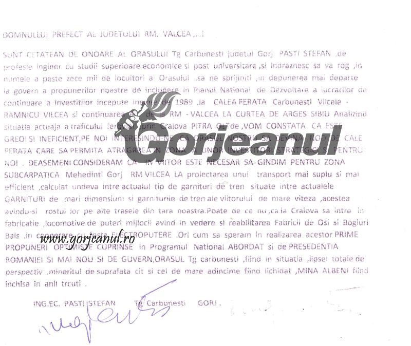 Un cetățean din orașul Târgu-Cărbunești a făcut nenumărate demersuri la autoritățile publice locale, județene și centrale și chiar la SN CFR în vederea realizării unei căi ferate, care să lege localitatea sa de Râmnicu Vâlcea și apoi de Curtea de Argeș. Deși nu a primit din nicio parte încurajări ori promisiuni că solicitarea sa s-ar putea materializa în viitorul apropiat, gorjeanul nu renunță la dezideratul său, știut fiind că înainte de Revoluția din 1989 proiectul de cale ferată cerut de el a fost prins în planul național de dezvoltare a zonei menționate.