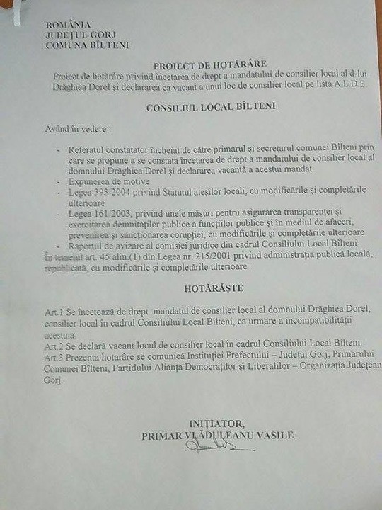 „Consilierul local Dorel Drăghia trebuia în termen de maxim 15 zile să-şi aleagă: fie postul de şef serviciu, fie cel de consilier local. Pentru că n-a făcut asta, secretarul comunei ne-a sesizat că există o incompatibilitate în cazul acelui consilier şi ne-a cerut să dăm ordin de încetare al mandatului de consilier local înainte de termen. Facem precizarea că prefectul poate da acest ordin numai în situaţia în care partidul îi retrage sprijinul politic şi nu în caz de incompatibilitate. În consecinţă, le-am transmis celor de la Primăria şi Consiliul Local Bîlteni că în prima şedinţă de CL pot lua hotărârea prin care Dorel Drăghia nu mai este consilier local. Noi nu dăm nimic în privinţa incompatibilităţii, ci aceasta o pot constata chiar ei. Hotărârea se ia doar la nivel de CL. Iar ceea ce consilierii locali au făcut săptămâna trecută, respectiv că au încetat mandatul consilierului local ce se afla în stare de incompatibilitate, este legal, în baza referatului făcut de secretarul comunei”, a declarat purtătorul de cuvânt al Instituţiei Prefectului – Judeţul Gorj, Corina Belteu.
