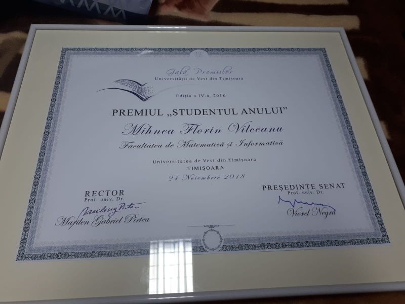 Gorjeanul Mihnea Florin Vîlceanu, șef de promoție al Universității de Vest din Timișoara-Facultatea de Matematică și Informatică, a obținut, săptămâna trecută, premiul “studentul anului” la specializarea unde învață. Nominalizate la aceeași categorie au mai fost două