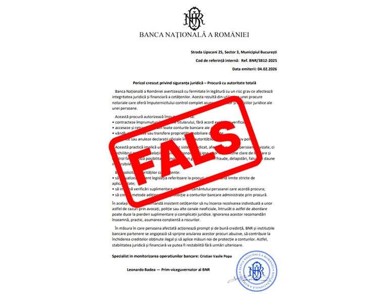 Banca Națională a României (BNR) atrage atenția publicului că documentul „Pericol crescut privind siguranța juridică – Procură cu autoritate totală” care circulă în spațiul online, datat 4 februarie 2026 și purtând sigla instituției, reprezintă un fals. BNR nu a emis, semnat sau aprobat un astfel de document și nu deține atribuții legale privind emiterea de avertismente referitoare la acte notariale sau procuri.
