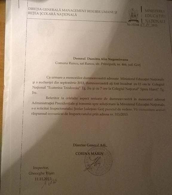 Profesorul a decis să-și caute dreptatea la Ministerul Educației, instituție care îi transmite în scris dacălului din Gorj prin adresa nr.10248 din 13.11.2013 că, urmare a memoriilor sale și audienței din septembrie, s-a depistat că s-au ascuns ore la Colegiul Național “Ecaterina Teodoroiu” și la Colegiul Național “Spiru Haret”. Urmare a acestei concluzii, profesorul primește ore la aceste unități școlare.