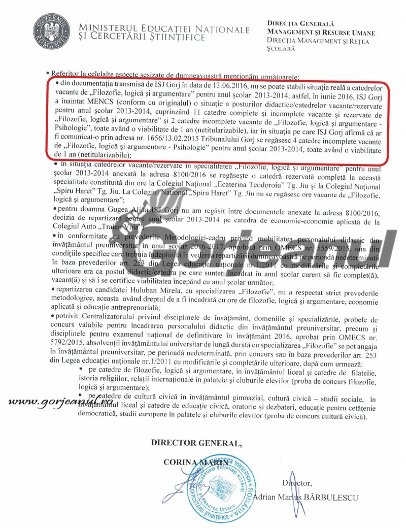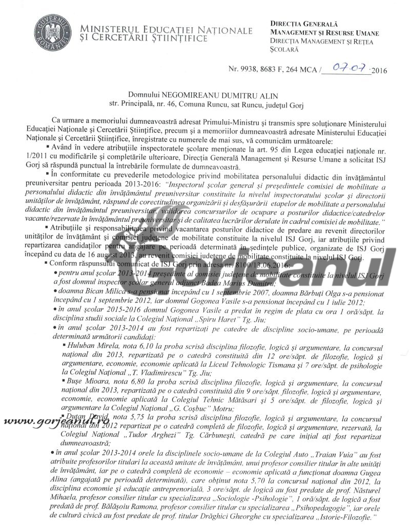 În schimb, Ișfan cu care am discutat atunci mergând în audiență, a preferat să împartă orele preferențial la pensionari, unul fiind Gogonea Vasile, alta fiind Olga Bărbuți ori Milica Bican. Asta în condițiile în care, Ministerul Educației mi-a transmis printr-o adresă că la acel moment, din documentația transmisă ministerului de IȘJ Gorj, <>. Mai exact, au comis fals în acte, document pe care l-am depus la dosarul aflat 894/p/2016 de la Parchetul Târgu-Jiu, dosar tergiversat”, a declarat, ieri, profesorul Negomireanu.