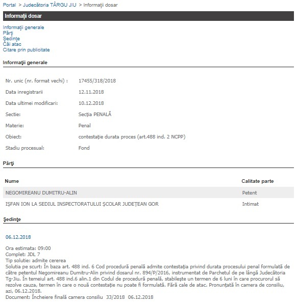 În 2016, profesorul care între timp ajunge să predea în județul Vâlcea, acceptând o navetă pe o distanță lungă, decide să facă o plângere penală, în februarie, împotriva lui Ion Ișfan, pe care l-a considerat principalul vinovat al faptului că nu avea locul de muncă conform titularizării sale din 2013 în Gorj. Dosarul nr.894/p/2016 nu se instrumentează în următorii doi ani, motiv pentru care reclamantul se adresează instanței ridicând problema tergiversării anchetei din dosarul penal respectiv.Pe data de 6 decembrie 2018, Judecătoria Târgu-Jiu îi dă dreptate reclamantului privind dosarul penal tergiversat de la Parchetul Târgu-Jiu și stabilește un termen de 6 luni în care procurorul să rezolve cauza. Sentința este fără cale de atac.