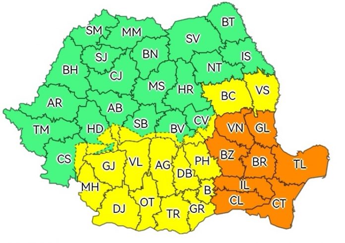 În intervalul menționat în județele Vrancea, Galați, Buzău, Brăila, Ialomița, Călărași, Tulcea și Constanța va ninge și va fi viscol. Vântul va avea intensificări susținute cu rafale de 75…85 km/h, iar vizibilitatea va scădea sub 50 m.