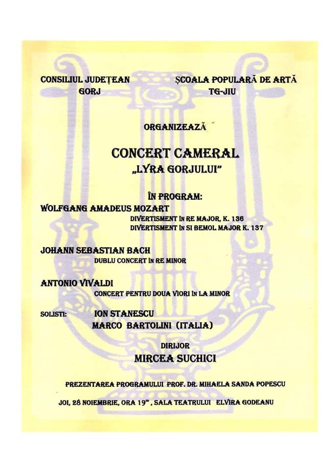 Alături de Orchestra de Cameră Lyra Gorjului vor evolua doi violoniști excepționali, de talie internațională: Ion Stănescu, fost membru al Filarmonicii Oltenia, colaborator al orchestrelor din Roma, Bolona, Torino și Neubrandemburg- Germania, și Marco Bartolini – violonist cu o bogată activitate, la San Pietro in Casale, Ancona, Jesi, Ravenna și Pesaro; concertează în Italia și peste hotare cu Orchestra Filarmonică FORMIG-Marchigiana, Orchestra Internațională a Italiei, Orchestra Simfonică Rossini, Orchestra Teatrului Regio din Parma, ORER-Orchestra „Arturo Toscanini”, Orchestra Teatrului Petruzzelli din Bari, Orchestra Operei Italiene.