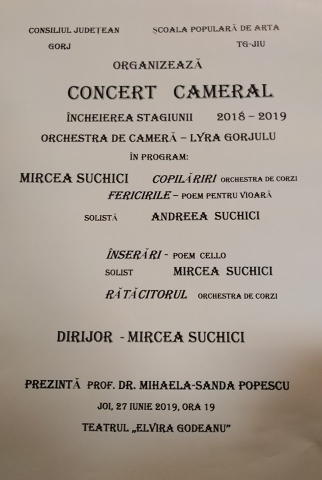 Orchestra de Cameră ,,Lyra Gorjului”, din cadrul Școlii Populare de Artă Târgu-Jiu, va susţine joi, 27 iunie 2019, la Teatrul Dramatic ,,Elvira Godeanu”, începând cu ora 19.00, un concert cameral. La pupitru va fi dirijorul și violoncelistul Mircea Suchici, iar ca solist invitat va fi Andreea Suchici.,,În concertul de închidere a stagiunii vă oferim spre audiere patru lucrări de mare frumusețe: Copilăriri – Orchestra de corzi, Fericirile – Poem pentru vioară, Înserări -Poem cello, Rătăcitorul – Orchestra de corzi”, anunţă organizatorii.Prețul unui bilet este de 15 lei, iar pentru elevi, studenți, pensionari este de 7 lei.