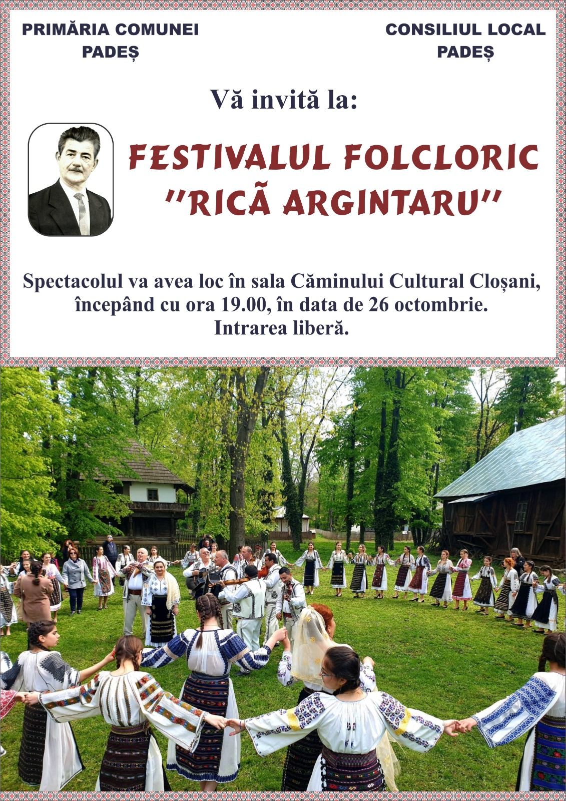 Primăria Padeș inițiază un nou proiect cultural: Festivalul Folcloric „Rică Argintaru”! Copiii de la Ansamblul de datini si obiceiuri populare ,,Roua Cloșani”, vă invită în data de 26 octombrie 2019, în sala Căminului Cultural Cloșani, să luați parte la acest eveniment! Ora începerii este 19.00, iar intrarea este liberă.