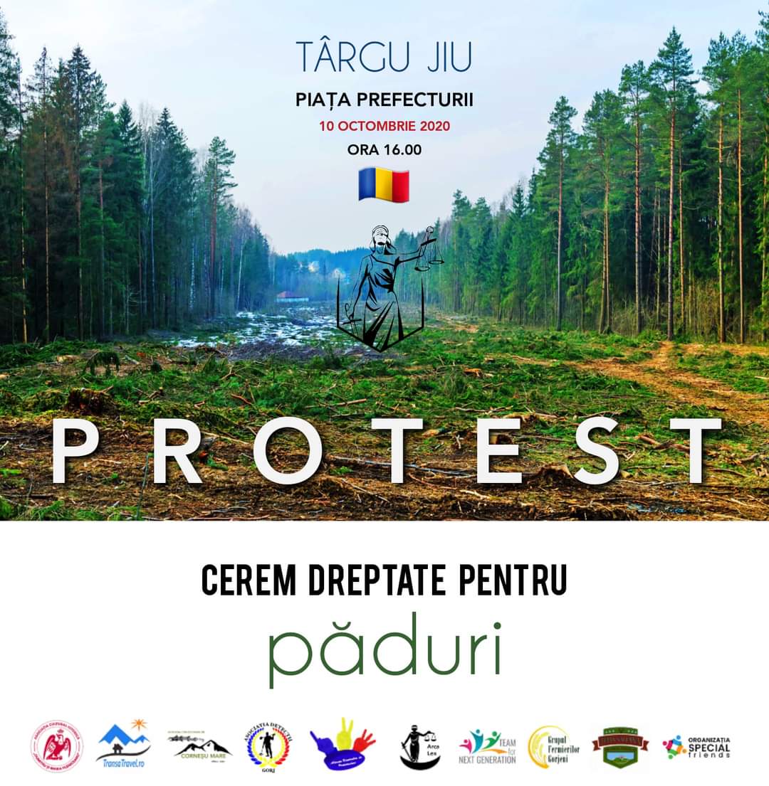 Sâmbătă, 10 octombrie 2020, la Târgu Jiu, de la ora 16.00, în Piața Prefecturii, se va organiza un nou protest împotriva exploatărilor ilegale de lemn din Gorj și din țară.