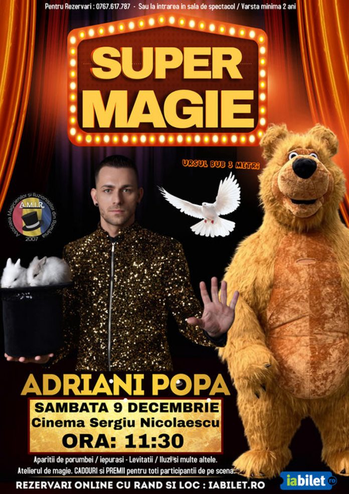 Magicianul Adriani Popa va veni cu un spectacol de apariții de porumbei, iepurași, numere de iluzionism, levitații, și multe altele. Alături de el, pe scenă va fi și Ursul Bub 3 Metri. ,,Un show de magie și iluzionism pentru întreaga familie… Un spectacol inedit cu numere de magie aduse din Thailanda, Coreea, India, Marea Britanie. Îți vom aduce zâmbetul pe buze și vei rămâne fascinat de cele mai noi numere de magie. Apariții de porumbei și iepurași, levitații și multe alte numere de magie incredibile. Va fi și Atelierul de Magie prin care poți învăța un truc de magie pe care-l poți lua acasă cu tine. Asistenții magicianului vor primi cadou un truc de magie. Show-ul este oferit de Adriani Popa, magician iluzionist, cu o experiență de peste 20 de ani în arta magiei și a iluzionismului, campion național al magiei, și membru al Federației Internaționale a Societăților de Magie”, au transmis organizatorii evenimentului. Biletele pentru acest spectacol de magie au fost deja puse în vânzare și pot fi achiziționate la prețuri cuprinse între 52,98 lei și 95,36 lei, în funcție de locul dorit a fi ocupat în sală.