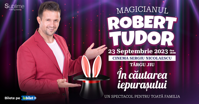 Robert Tudor va poposi din nou la Târgu-Jiu pe 23 septembrie cu cele mai grozave numere de magie, la Cinematograful ,,Sergiu Nicolaescu”. Evenimentul va începe la ora 18.00, fiind intitulat ,,În căutarea iepurașului”. Prețurile biletelor pornesc de la 68 de lei și ajung chiar și la 122 lei, cele mai scumpe fiind dedicate celor care doresc și o întâlnire cu Robert Tudor după spectacol, dar și un autograf. ,,În căutarea iepurașului este un spectacol ce îmbină distracția cu numere de magie educative și interactive. Atunci când un magician se desprinde de mentorul său și pornește, de unul singur, în aventura sa, primește în dar un iepuraș care să-i fie alături în călătoria sa. Alături de partenerul său, magicianul Robert Tudor, preferatul tuturor copiilor, uimește pe oricine îi iese în cale. Însă, într-un moment de neatenție, la o lecție de magie, Robert a rostit formula greșită făcându-l pe iepuraș să dispară, iar acum are mare nevoie de ajutorul copiilor să îl găsească. Plecăm alături de magicianul Robert Tudor în căutarea iepurașului cu o valiză plină de trucuri și iluzii pregătite pentru toți cei care îndrăznesc să creadă în magie. Ne vom juca, vom râde și vom învăța despre cei care au schimbat această lume prin viziunea lor atipică. Vrem să ne bucurăm alături de cei mici și să le oferim un spectacol memorabil, încurajându-i să creadă că nimic nu e imposibil. Deși pentru unii sunt doar trucuri, pentru noi sunt calea către universul imaginației noastre”, transmit organizatorii spectacolului de magie.