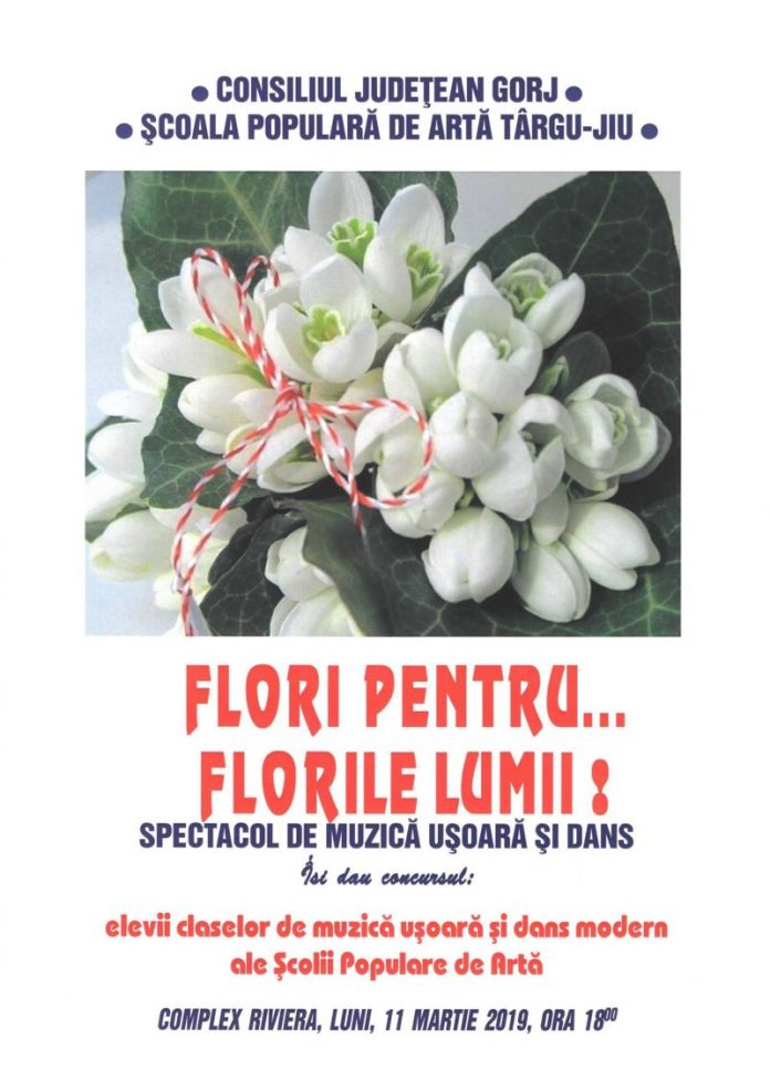 Ca în fiecare an, Școala Populară de Artă Târgu-Jiu oferă doamnelor și domnișoarelor un spectacol de muzica și dans, intitulat „Flori pentru florile lumii”. Evenimentul va avea loc astăzi, 11 martie, începând cu ora 18.00, la complexul Riviera, intrarea la acest spectacol este liberă. Atmosfera va fi întreținută de cursanții clasei de canto muzică ușoară, coordonați de prof. Bivolaru Sorin, Ciobanu Tudorel și Constantin Șerbănescu. În program se vor regăsi, de asemenea, dansuri moderne susținute de elevii care urmează cursurile acestei unități, coordonați de prof. Camelia Costea, Carmen Mărgulescu și Gabriel Costea. ,,Vom avea parte de momente deosebite, pline de sensibilitate oferite de cursanții noștri. Vă așteptăm cu drag la acest eveniment dedicat femeii!”, a transmis conducerea Școlii Populare de Artă Târgu-Jiu.