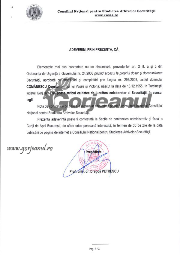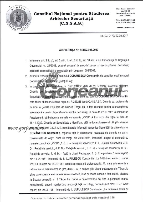 Constantin Comănescu a fost consilier local PP-DD până în vara lui 2016. Cu această ocazie a fost verificat de CNSAS, dar răspunsul a venit de aici abia la un an după ce alesul Comănescu nu mai făcea parte din Consiliul Local Turcinești. În adeverința 1448, CNSAS informează că alesul local “este titular al dosarului fond reţea nr. R 253215 (cotă C.N.S.A.S.). Domnia sa, profesor de muzică la Şcoala Populară de Muzică Târgu-Jiu, a fost recrutat pentru supravegherea informativă a unei colege aflată în atenţia Securităţii; la data de 27.03.1981 a semnat un Angajament, atribuindu-se numele conspirativ „VICU”. A fost scos din reţea la data de 16.11.1982”.