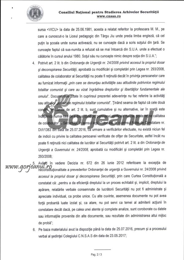 fostă la Liceul Pedagogic; 8. Ş. E. – profesor.”, arată CNSAS. O Notă raport, din 14.04.1981, întocmită de It. LUPULESCU Constantin relevă următoarele: “La întâlnirea avută cu sursa la data de 14.04.1981, acesta a relatat că profesoara M. M., care actualmente a refuzat să se mai întoarcă în ţară, din S.U.A., a activat şi la Liceul pedagogic din Târgu-Jiu şi pe care sursa a avut ocazia să o cunoască, însă perioada aceea a fost scurtă, plecând la Şcoala generală nr. 1 Târgu-Jiu. Sursa a caracterizat-o ca fiind o persoană mereu nemulţumită, uneori manifestând aroganţă faţă de colegi, dar mai ales elevi. /…/.”. O altă notă raport, din 25.06.1981, întocmită de It. LUPULESCU Constantin relevă că: “La întâlnirea avută cu sursa la data de 25.06.1981, acesta a relatat referitor la profesoara M. M., pe care a cunoscut-o la Liceul pedagogic din Târgu-Jiu unde preda limba engleză, că cel puţin la şcoala unde sursa activează, nu se cunoaşte dacă a scris soţului din ţară. Se cunoaşte faptul că sus-numita a refuzat să se mai întoarcă din S.U.A. unde a efectuat o călătorie în cursul anului 1980. Soţul său nu cunoaşte nimic despre soţia din S.U.A.’’.