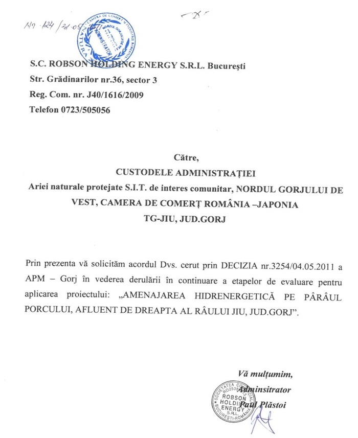 Prin același expert evaluator, s-a întocmit DOCUMENTAȚIA TEHNICĂ, s-a predat custodelui ROSCI 0129 NORDUL GORJULUI DE VEST solicitând ACORDUL pentru lucrări de interes comunitar, înregistrat cu nr. 124 din 31.05.2011.