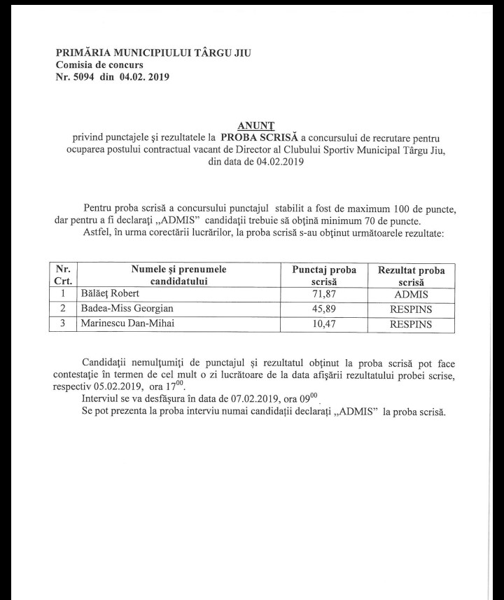 Robert Bălăeț a fost singurul candidat care a fost declarat admis astăzi, la concursul organizat de Primăria Târgu Jiu în vederea numirii unui director la Clubul Sportiv Municipal. La proba scrisă s-au prezentat trei candidați, însă numai Robert Bălăeț a primit punctaj de trecere, fiind notat cu 71,87 de puncte. Contestațiile pot fi depuse până mâine după amiază, la ora 17:00. Proba de interviu este programată pentru data de 7 februarie, ora 09:00.