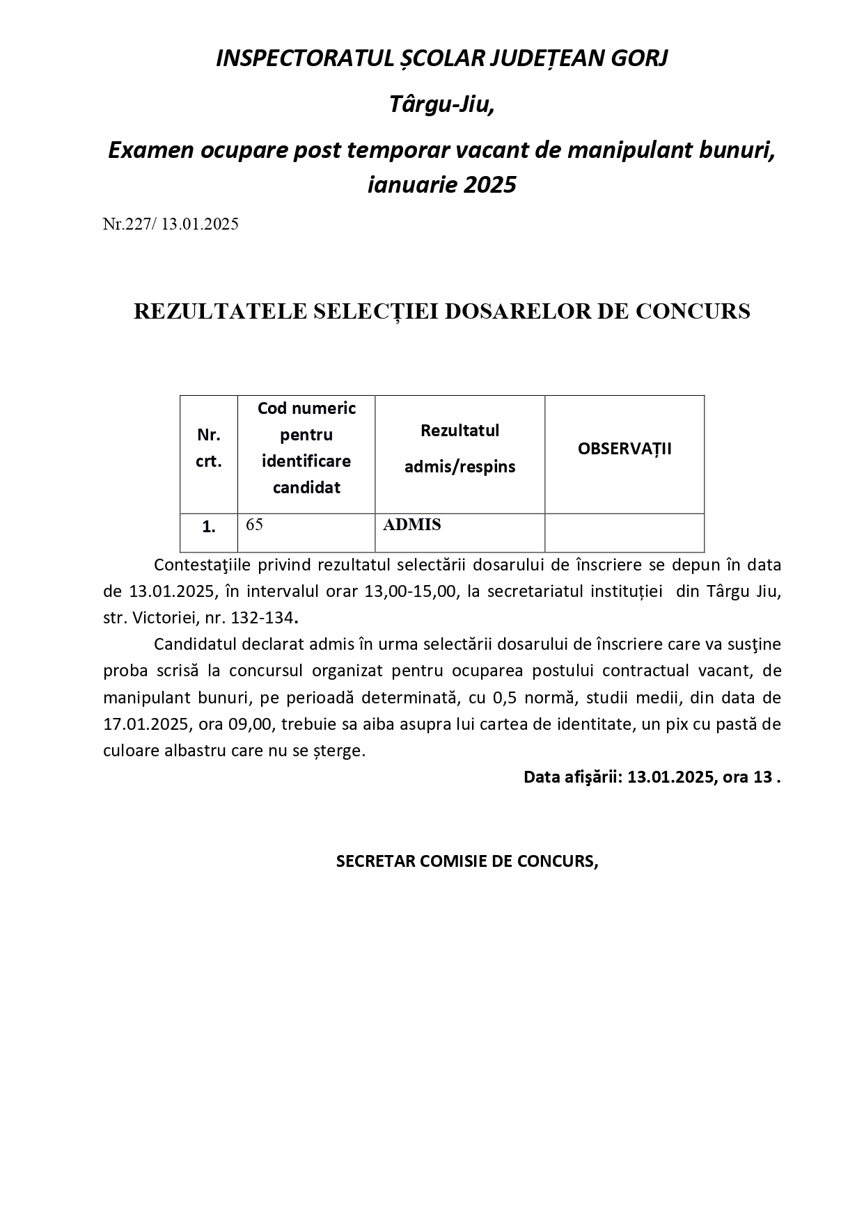 „Candidatul declarat admis în urma selectării dosarului de înscriere care va susţine proba scrisă la concursul organizat pentru ocuparea postului contractual vacant, de manipulant bunuri, pe perioadă determinată, cu 0,5 normă, studii medii, din data de 17.01.2025, ora 09,00, trebuie să aibă asupra lui cartea de identitate și un pix cu pastă de culoare albastră, care nu se șterge”, a anunțat Inspectoratul Școlar Județean Gorj.