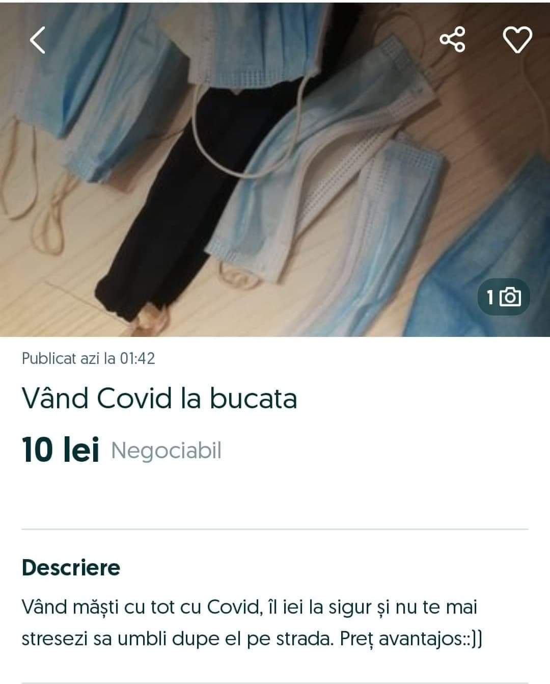 Un târgujian a pus la vânzare măști chirurgicale gata folosite. Tânărul cere 10 lei pe bucată și transmite că cei care vor să se infecteze nu trebuie să se mai chinuie să ia virusul de pe stradă. Așa pot da coronavirusul la prieteni, spune vânzătorul care pare dispus la glume proaste.