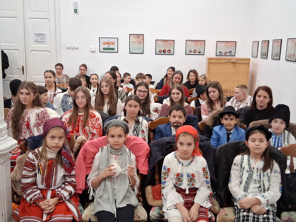 Așadar, joi, 22 ianuarie 2026, în jurul orei 14:00, Sala Indiană a Muzeului Județean de Istorie „Alexandru Ștefulescu” din Târgu Jiu, era plină de zeci de elevi de gimnaziu și liceu, marea majoritate îmbrăcați în frumoase costume populare. A făcut excepție, o singură clasă de la școala primară. O clasă de-a patra, de la Școala Gimnazială „Antonie Mogoș” Ceauru-Bălești, Structura Cornești, coordonată de către domnul învățător Mircea MERCIOIU, care a prezentat sceneta „Moș Ion Roată și Unirea”. Dar, majoritatea, așa mici cum erau, purtau costume populare.