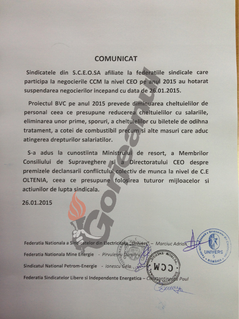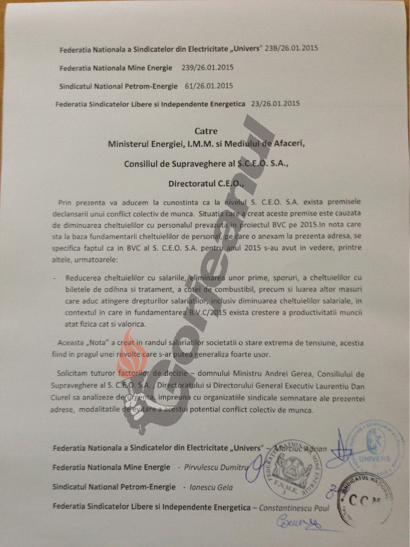 Reducerea cheltuielilor cu salariile, eliminarea sporurilor, primelor, a cheltuielilor cu biletele de odihnă şi tratament, a cotei de combustibil precum şi luarea unor măsuri care aduc atingere drepturilor salariaţilor CEO, toate propuse de managerul Laurenţiu Ciurel, săptămâna trecută, a impus stoparea negocierilor contractului colectiv de muncă, începând de luni. Membrii celor patru federaţii sindicale, în frunte cu Univers, au solicitat ministrului Energiei, managerului CEO, dar şi Directoratului şi Consiliului de Supraveghere să analizeze situaţia de fapt şi chiar să stopeze conflictul de muncă care se prefigurează la orizont. “Această «Notă» a creat în rândul salariaţilor societăţii o stare extremă de tensiune, aceştia fiind în pragul unei revolte care ar putea generaliza foarte uşor”, transmit liderii celor patru Federaţii, în cursul zilei de ieri.
