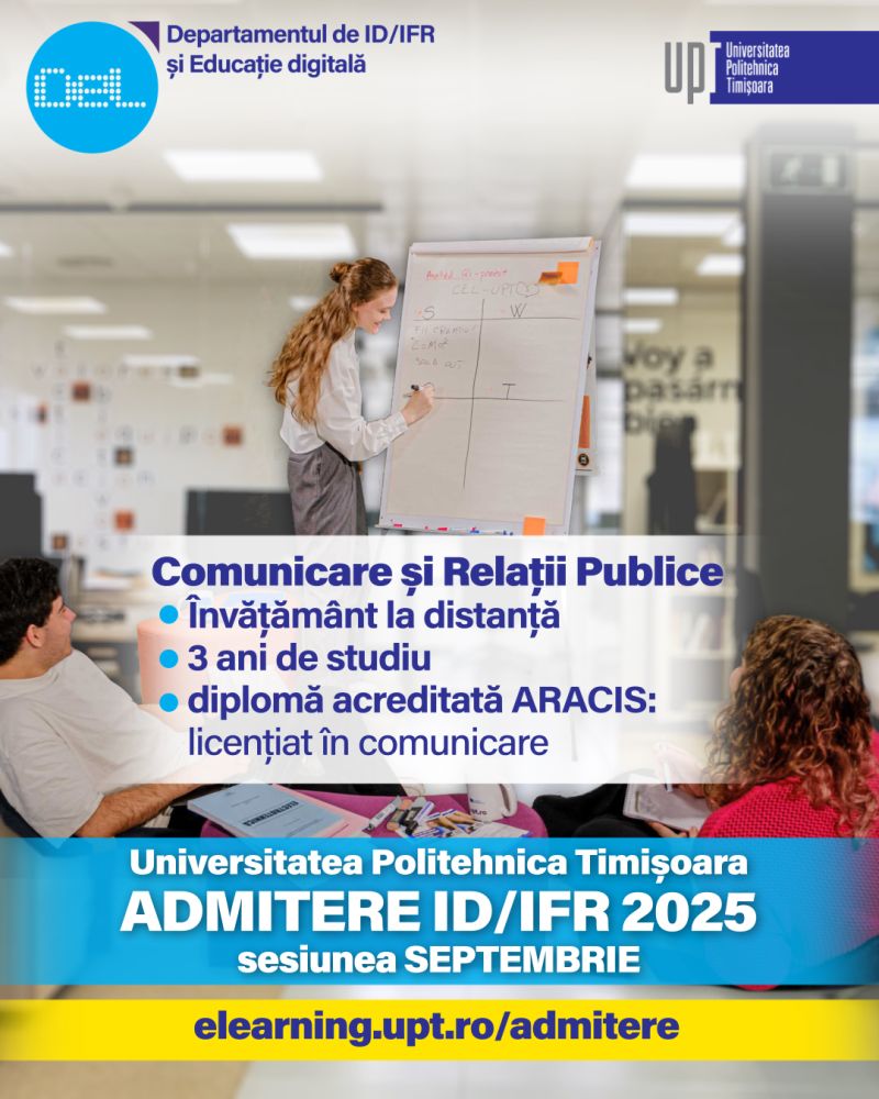 Vezi toate detaliile despre specializare: https://elearning.upt.ro/ro/programele-de-studiu/licenta/comunicare-si-relatii-publice/