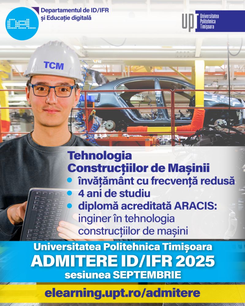 Pregătește-te pentru succes cu programele de studiu la distanță (ID) și cu frecvență redusă (IFR) ale Universității Politehnica Timișoara: Informatică ID, Tehnologii și Sisteme de Comunicații ID, Comunicare și relații Publice ID, Tehnologia Construcțiilor de Mașini IFR. Înscrieri exclusiv online, prin Enroll.