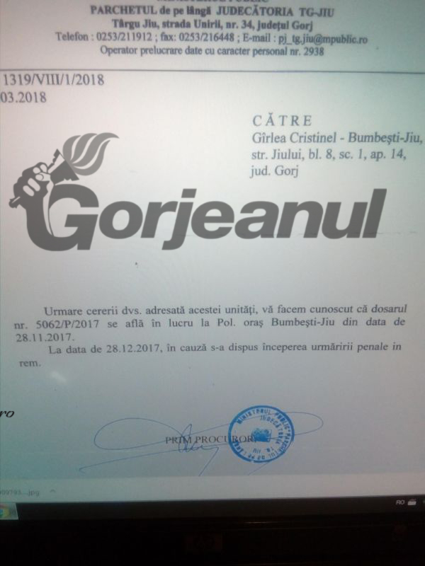 În martie 2018, Cristinel Gîrlea solicită Parchetului de pe lângă Judecătoria Târgu-Jiu informații legate de plângerea sa penală, depusă aici în noiembrie 2017.