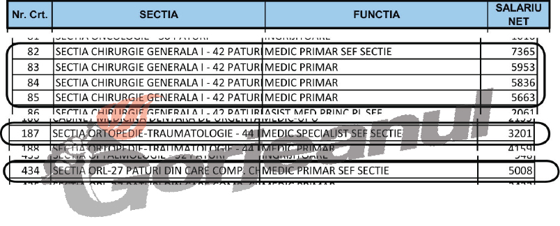 Situaţia hilară de la Ortopedie, unde sunt asistente care câştigă mai mult decât şeful secţiei, este de neînţeles şi pentru medicul Gheorghe Stanciu, care precizează că „inclusiv la nivel central s-a discutat că niciodată, cel mai mare salariu al unei asistente nu trebuie să depăşească cel mai mic salariu al unui medic de pe secţia respectivă”.