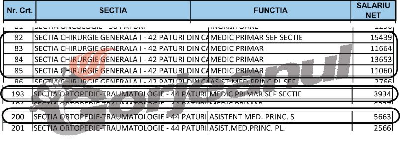 În această lună salariile unor medici s-au dublat datorită recuperării sporurilor câştigate în instanţă. Cu toate acestea, şi în lunile anterioare, înainte inclusiv de aplicarea majorărilor aprobate de CJ şi de Guvern, diferenţele salariale sunt remarcabile. Pe luna septembrie, spre exemplu, la Chirurgie I medicul şef a încasat 7.403 lei, cel de la Chirurgie II – 5.547 lei, în timp ce şeful Secţiei Urologie a luat 5.098 de lei, medicul şef de la ORL a obţinut 5.114 de lei, iar şeful de la Pediatrie a avut 4.854; în luna august, şeful Chirurgiei I a luat 7.365 de lei, medicul şef de la Chirurgie II a obţinut 5.370 de lei, şeful ORL a luat 5.008 lei, iar cel de la Urologie 4.201 de lei.