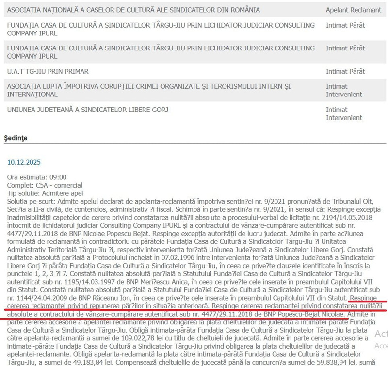 Decizia din 10 decembrie a.c. a Curții de Apel Craiova a fost mixtă. Judecătorii au constatat că anumite clauze din acordurile vechi sunt problematice, dar au respins cererile care ar fi readus părțile la situația anterioară sau ar fi anulat în totalitate contractul de vânzare prin care Primăria Tg-Jiu a devenit proprietară. Cu alte cuvinte, instanța a recunoscut că există vicii în documentele încheiate în urmă cu aproape trei decenii, dar a păstrat, pentru moment, efectele tranzacției care a adus clădirea în patrimoniul municipalității.