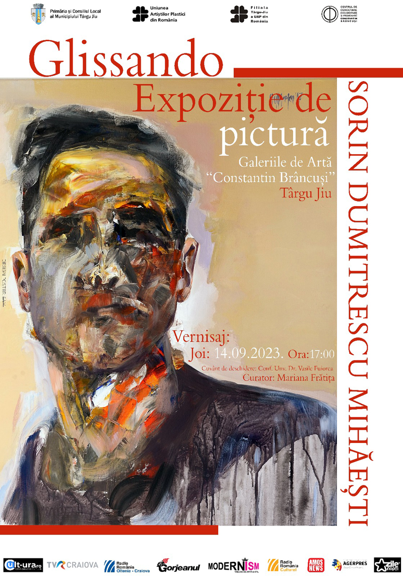 Joi, 14 septembrie, de la ora 17:00, Filiala Târgu-Jiu a Uniunii Artiștilor Plastici din România, în parteneriat cu Centrul de Cercetare Documentare și Promovare ,,Constantin Brâncuși”, organizează la Galeriile de Artă ,,Constantin Brâncuși” din Târgu-Jiu vernisajul expoziției de pictură ,,Glissando”, a artistului Sorin Dumitrescu Mihăești. Curatorul expoziției este Mariana Frătița, iar cuvântul de deschidere îi va aparține artistului gorjean Vasile Fuiorea. Expoziția este deschisă publicului în intervalul calendaristic 14 – 30 septembrie.