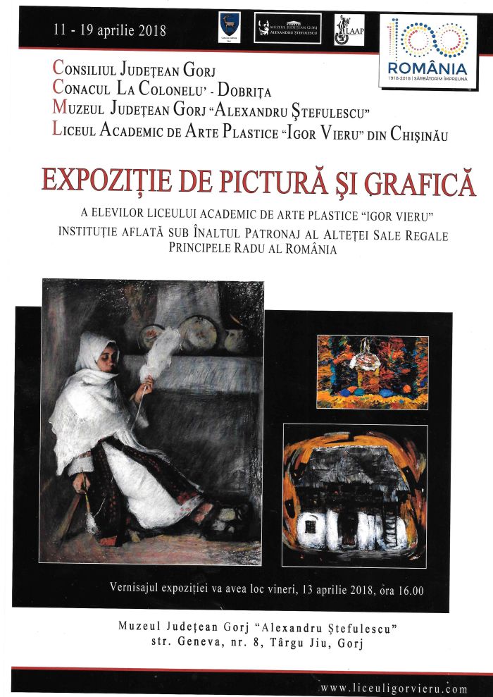 Petre Bumbaru, proprietarul conacului ,,LA COLONELU,, din Dobrița-Gorj, cu sprijinul Consiliului Județean Gorj și al Muzeului Județean Gorj, organizează expoziția de pictură și grafică a elevilor Liceului Academic de Arte Plastice ,,Igor Vieru” din Chișinău. Vernisajul va avea loc vineri, 13 aprilie 2018, la ora 16.00. Lucrările sunt realizate atât în cadrul atelierelor liceului, cât și în tabara de creație ce se desfășoară în perioada 11-19 aprilie la conacul ,,LA COLONELU”. La eveniment vor participa personalități politice ale orașului, precum și cadre didactice, elevi și studenți.