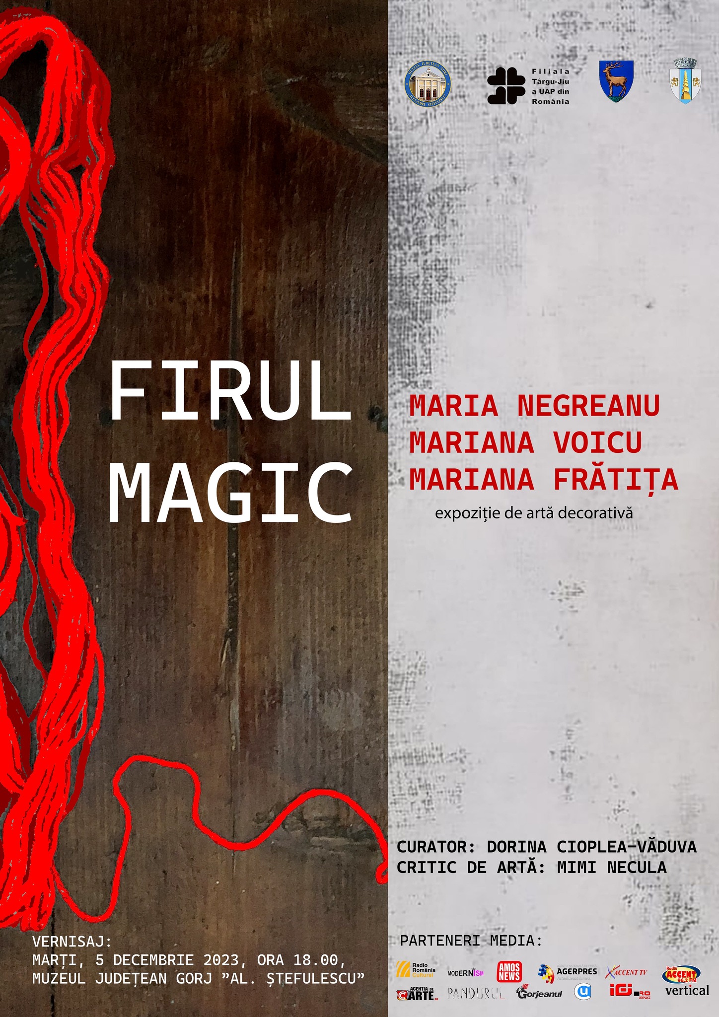 În această seară, de la ora 18.00, la Muzeul Județean Gorj ”Alexandru Ștefulescu” din Târgu Jiu va avea loc vernisajul expoziției de artă decorativă ”Firul magic”, care le aduce pe aceleași simeze pe artistele Maria Negreanu, Mariana Voicu și Mariana Frătița. Legate prin dragostea pentru textile, fire, materiale și texturi, cele trei creatoare propun lucrări profunde, cu valoare decorativă și pline de simbolistică. Expoziția este deschisă publicului până în ianuarie 2024. Curator: Dorina Cioplea-Văduva. Critic de artă: Mimi Necula.